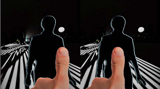 That means, if we do not aim our eyes at things near us, we can create artificial overlapping of the images in the left and right retina. Now place the ‘lost eyed’ figure at a distance of around one foot in front of your eyes. As the figures are facing you, your eyes will tend to aim at it. But relax the eyes. Do not aim the stereogram. Try to look at the horizon through the figures. It may take several attempts. But it’s not a difficult job to do. Your eyes would be looking like as shown in the same figure. And eventually the 3D sensation will appear automatically.