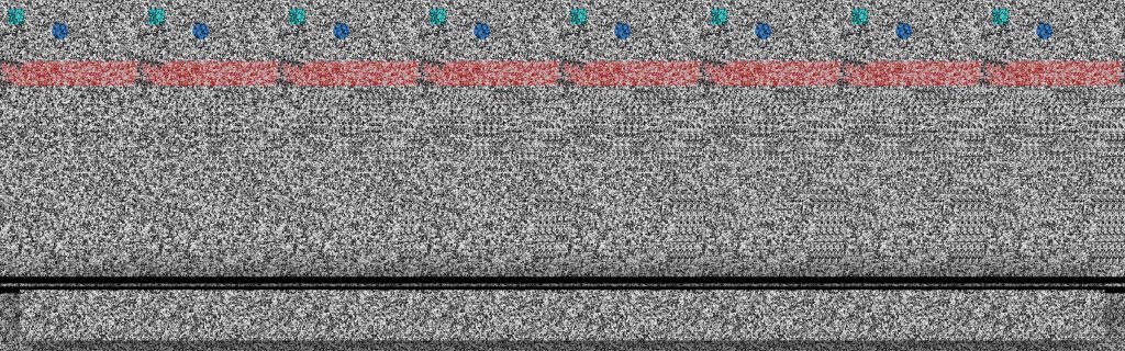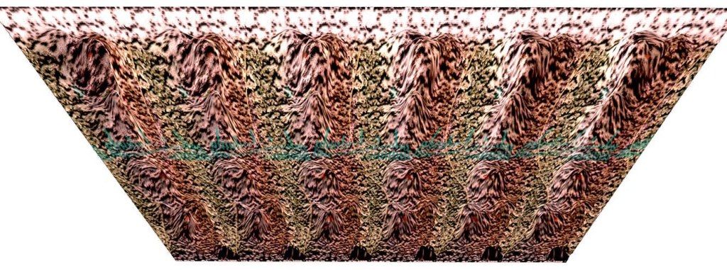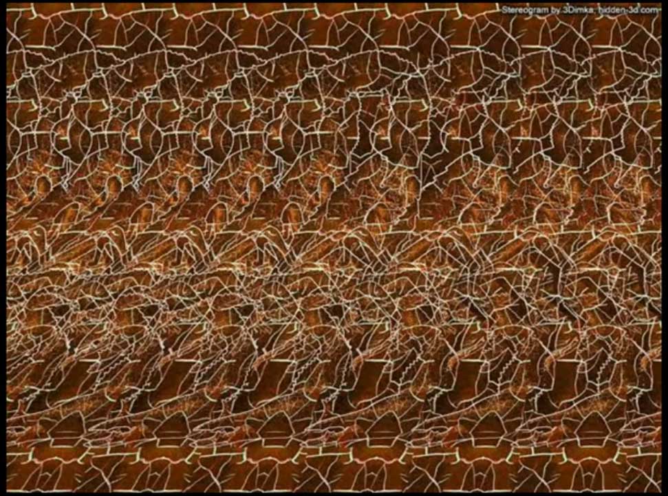 In both of the last images some identical pattern is repeated several times with slight but significant changes. So each adjacent couple of identical things overlap and their disparity feels like the 3D. The same background is used in the next one also which is a crossed eyed 3D: