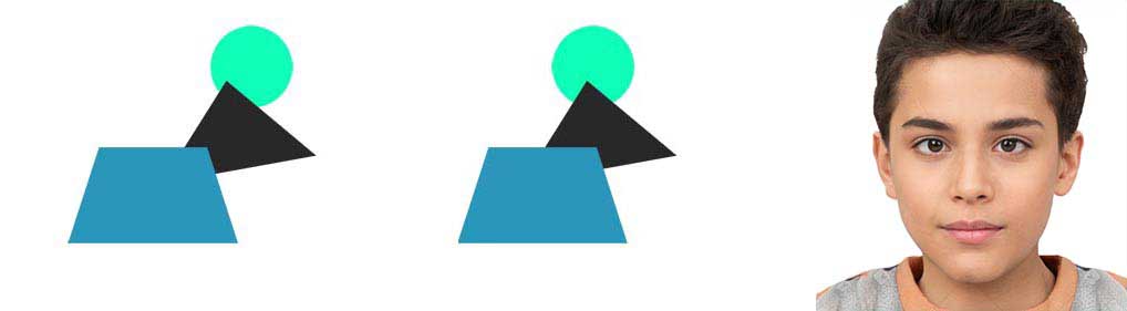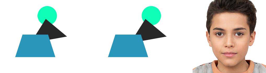 You can clearly see, the blue trapezium is covering more of the black triangle in the left set and less in the right. This is a parallel view or back view stereogram, a ‘lost eyes’ case. If we switch the left and right sets of figures then we get a crossed view or front view stereogram, a ‘crossed eyes’ case. It’s as follows: