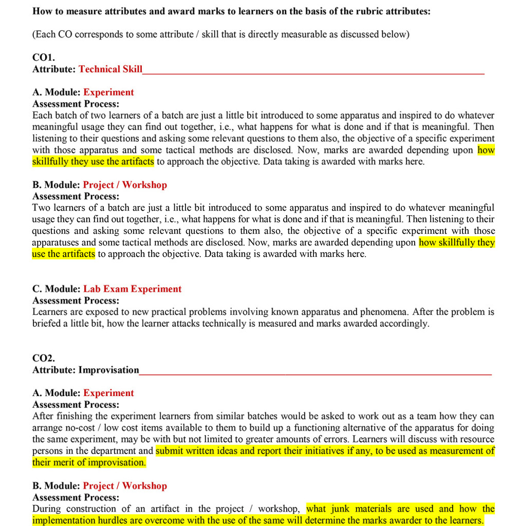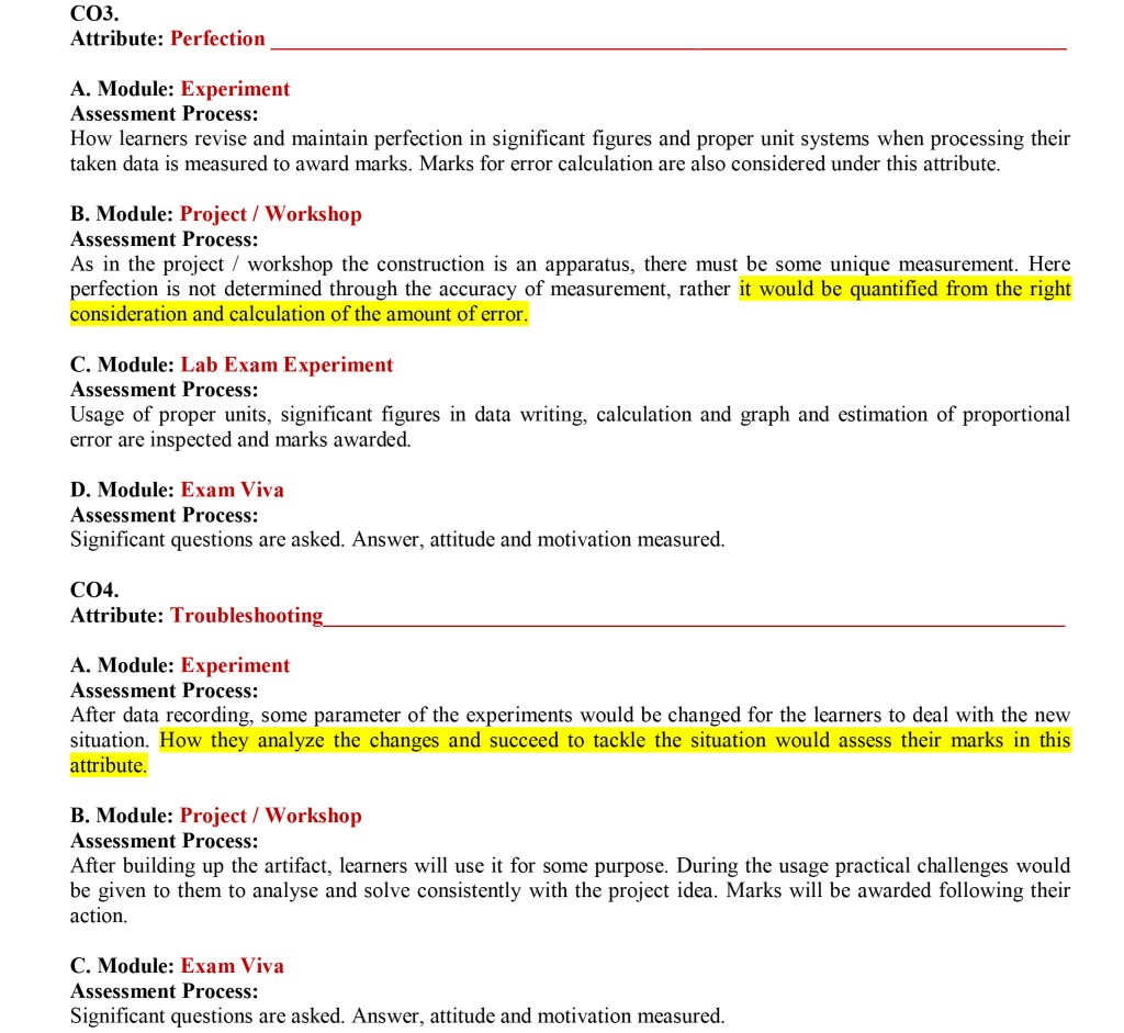 the total number of BSH COs. There are well defined methods for measuring theoretical COs as well as for measuring Practical COs with a professional rubric and marking table system for continual assessment.