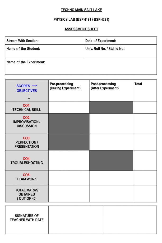 - After completion of data taking come to your teacher for verification and a signature. If you leave the room without a signature on the data taken, your work would be discarded. Produce the marking table for getting marks.